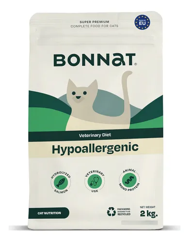 Bonnat Gato Hypoallergenic 2kg es un alimento completo especialmente formulado para gatos adultos, diseñado para reducir la intolerancia a ingredientes y nutrientes. Con un contenido de proteína bruta del 28%, este alimento seco de sabor salmón no solo satisface el paladar de tu mascota, sino que también apoya su salud general.