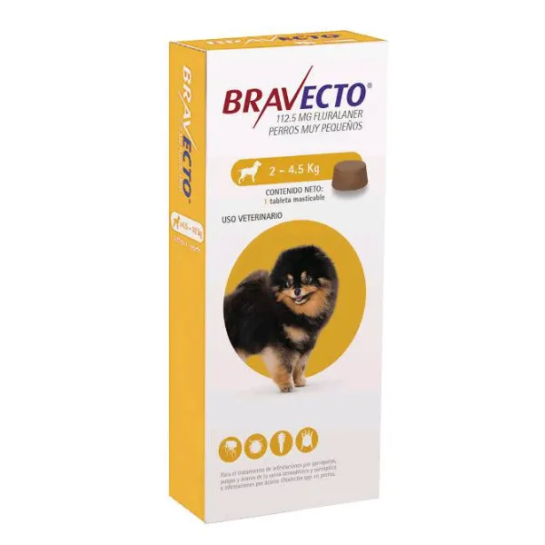Bravecto tiene un principio activo que busca combatir de raíz pulgas y garrapatas en nuestros perros, ayudando así a controlar estas plagas que afectan el organismo de nuestras mascotas. Durante 12 semanas o incluso mas nuestro peludo va a tener una capa protectora que lo protegerá constantemente de estas amenazas y dejara que tenga una vida saludable y sin complicaciones.