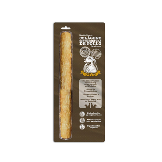 Los masticables de colágeno con cobertura de pollo Lopets son hechos con Colágeno real extraído de la piel del ganado brasileño alimentado 100% con pasto orgánico. Las proteínas de colágeno son hidrolizadas y luego se rompen a través de un proceso de calentamiento, convirtiéndolas en partículas mucho mas pequeñas y fáciles de digerir. Luego el colágeno es formado, horneado y sumergido en una masa hecha con Pollo real.