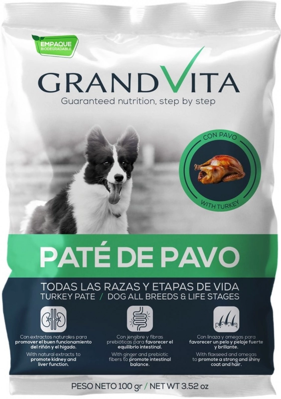 El Paté de pavo Grand Vita, un alimento húmedo indicado para perros de todos los tamaños y etapas de vida, una excelente opcion para complementar la alimentación diaria de tu perro