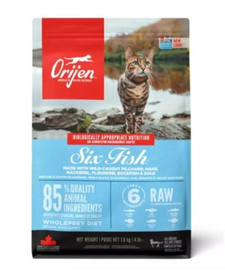 ORIJEN CAT SIX FISH es un alimento seco premium que ofrece una nutrición excepcional, con proteínas de alta calidad de seis tipos de pescado fresco y silvestre, imitando la dieta natural rica en proteínas animales de los felinos.